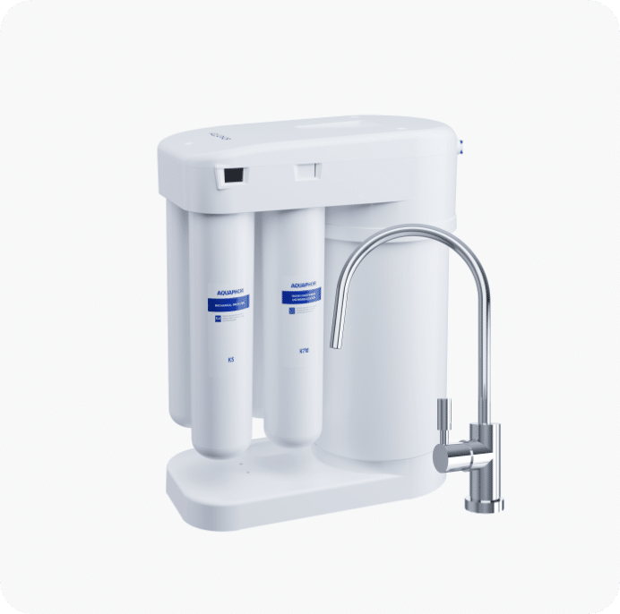 As a rule, a POU flow-through water filtration system is installed in the kitchen under the sink and connected to the water pipe (that’s why it refers to the general category of under-sink systems). The filter comes with a separate tap and replaceable cartridges. You can easily replace them yourself in the AQUAPHOR Crystal and Pro series.