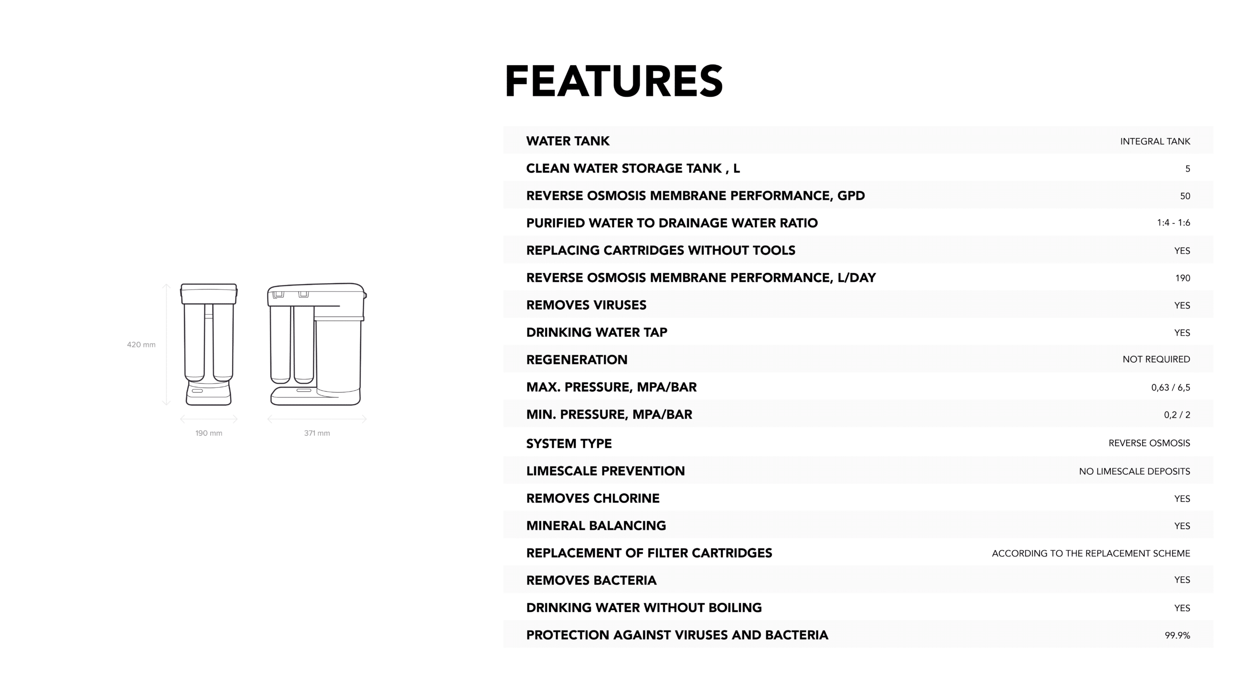 The reverse osmosis system RO-101S covers all issues of home water purification and completely replaces premium bottled water — besides, it’s much more budget-friendly.