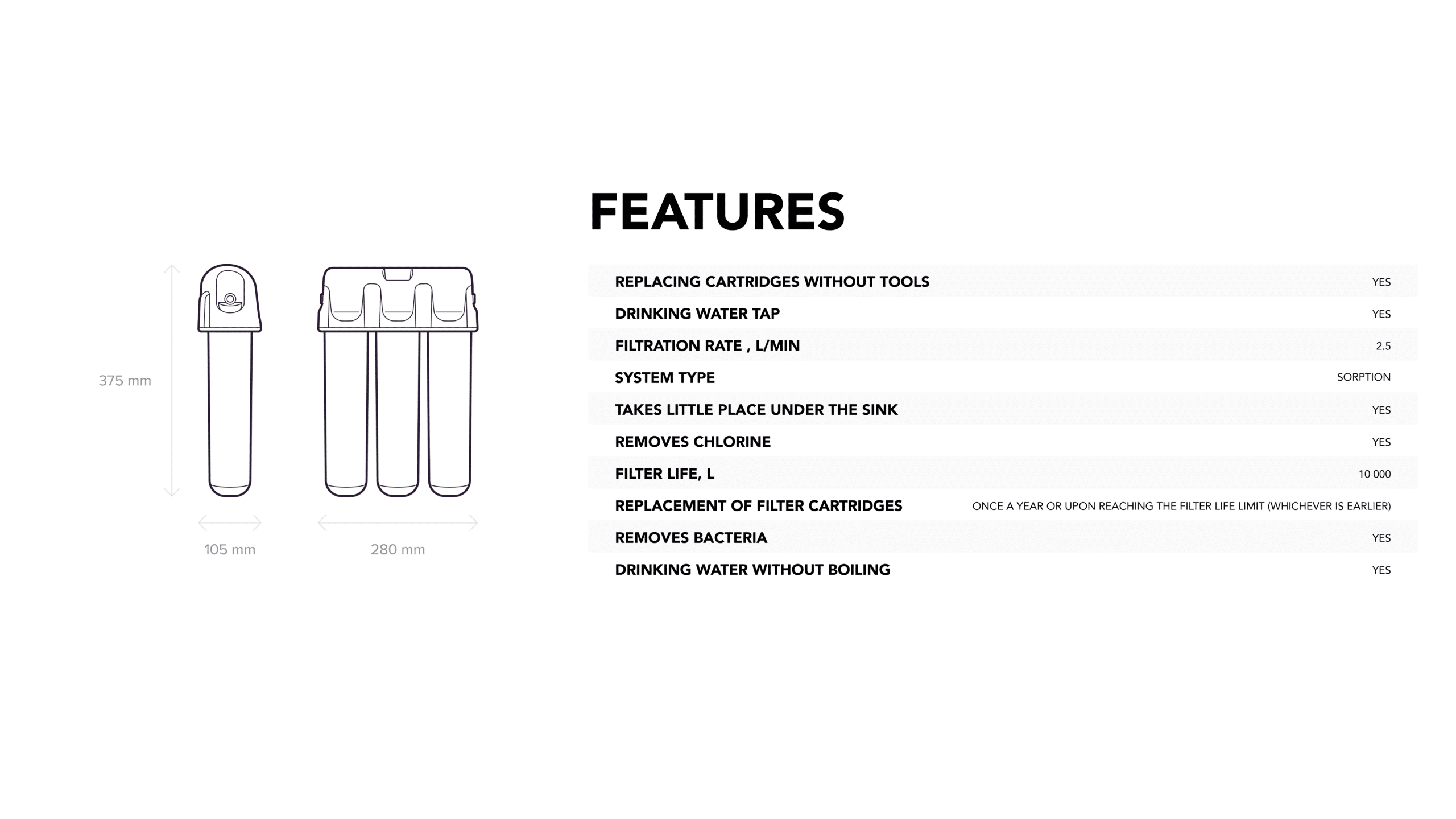 ECO Pro filter includes an innovative 2-in-1 pre-treatment cartridge Pro 1, carbon block unit Pro 2 for deep filtration, and hollow fiber membrane in the Pro HF unit for enhanced antibacterial protection against bacteria and cysts resistant to chlorine and boiling. Cartridges of Pro series are the state-of-the-art solution for quality water filtration.