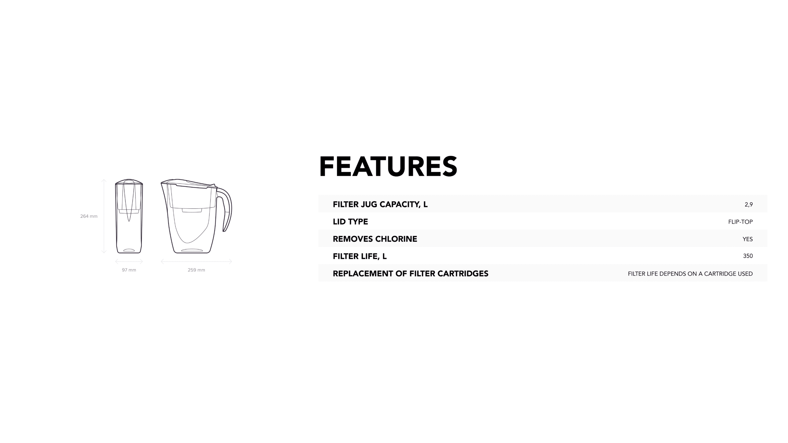 Despite its small size, the purification performance of Smile water jug is astonishing, provided by the new Aquaphor A5 filter. More filtration media, combined with a special pre-filter cap on top, gives A5 a longer lifespan – up to 350 L in turbid water. A5 also enriches water with magnesium for health benefits and better taste.